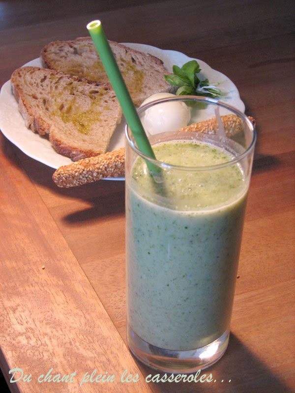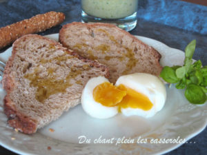 Pour accompagner le smoothie (parce que cela ne remplit l’estomac que pendant la 1/2h qui suit…), je propose de l’accompagner de tranches de pain de campagne parsemées d’un filet d’huile d’olive et d’un œuf mollet ou coque. Les feuilles de basilic sont optionnelles, si on aime, on peut les ciseler sur les tartines de pain de campagne nappées d’huile d’olive.
