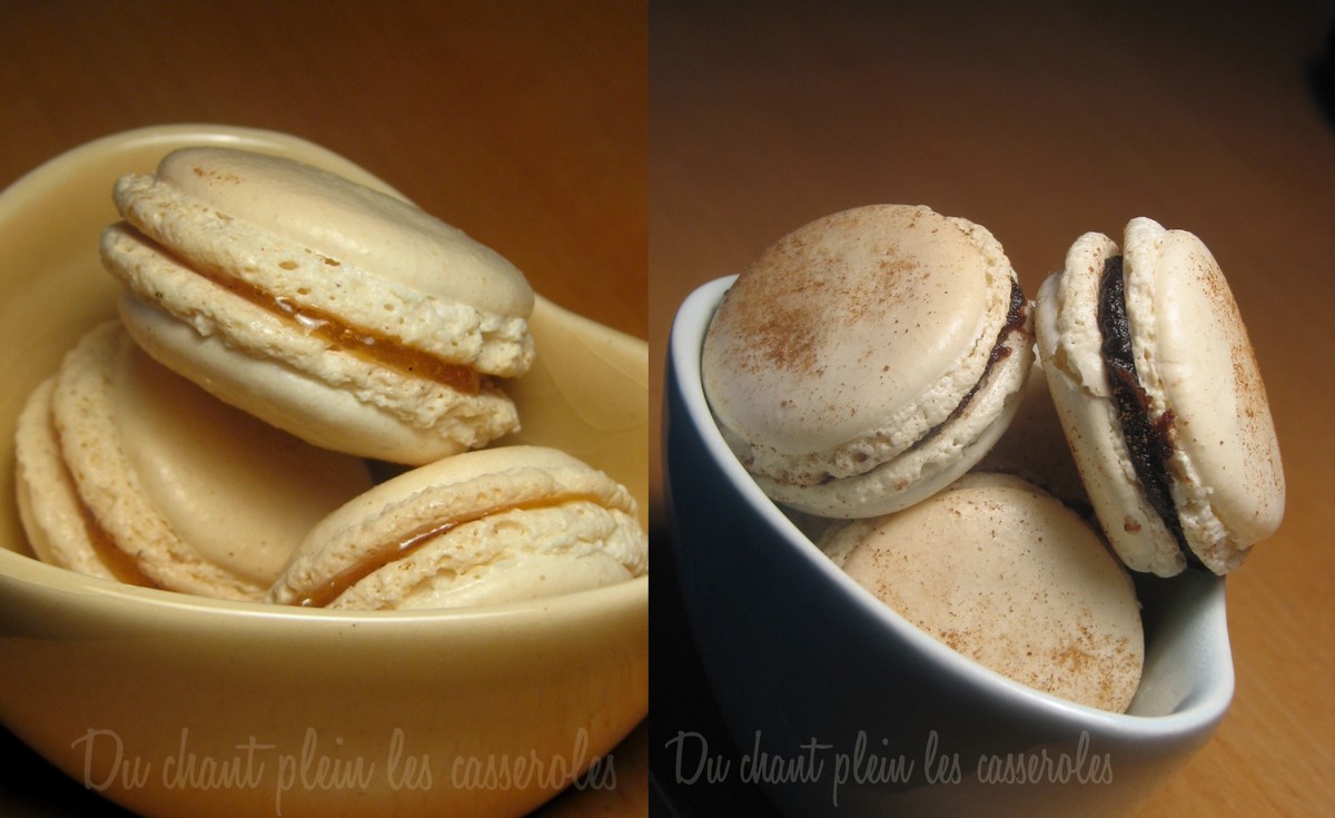 5. Pour la version aux dattes seulement : avant d’enfourner les macarons, saupoudrez les coques d’un voile de cannelle en poudre à l’aide d’une passoire. Pour la version aux poires, ne faites rien de spécial. Faites cuire 10 à 15 minutes (temps très variable selon les fours). Au bout de 5-6 minutes, la collerette doit commencer à se former. A partir de ce moment, surveillez attentivement la cuisson : les macarons ne doivent en aucun cas brunir, ils seraient trop cuits. Lorsqu’ils paraissent fermes et prêts à se détacher de la plaque, sortez-les du four, déposez la feuille de cuisson sur un plan de travail humide pour faciliter le décollage, retournez les coques pour les laisser sécher. Si jamais les macarons restent collés à la feuille de cuisson ou se détachent difficilement, c’est sûrement qu’ils ne sont pas assez cuits. Vous pouvez réenfourner pour qq minutes en surveillant bien.