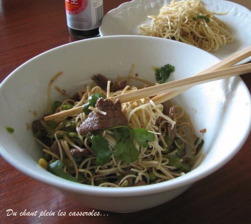 5. Ajouter alors les pâtes, la ciboule émincée, et les lamelles de bœuf. Bien mélanger tout en poursuivant la cuisson 1 minute. Parsemer de coriandre ciselée et servir.